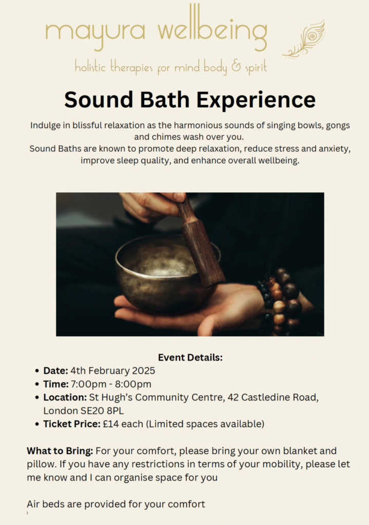 Our super-popular Sound Bath Experience is back on Tuesday 4th February at St Hugh’s Centre in Anerley.