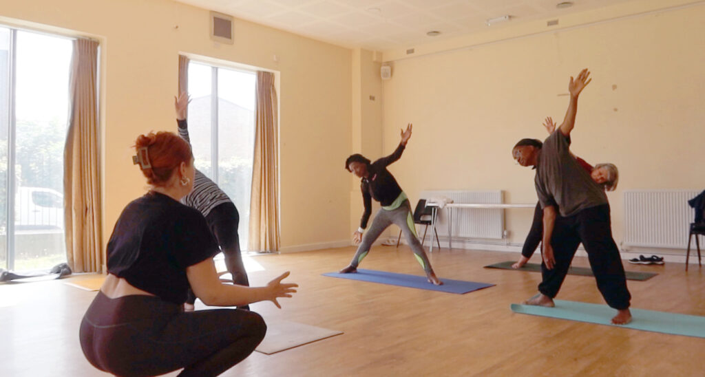 We offer chair-based yoga sessions for people with limited mobility, and our gentle mat-based hatha yoga sessions: